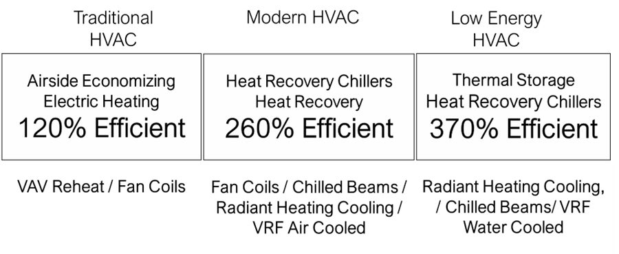 Decarbonizing a building’s HVAC requires focusing on ways the cooling and heating systems can work together to provide energy as efficiently as possible. Below is a rough estimate of the annual system efficiency to move heat for a large campus of office buildings where utilizing effective heat recovery systems and hydronic distribution were able to boost the efficiency by 3x.