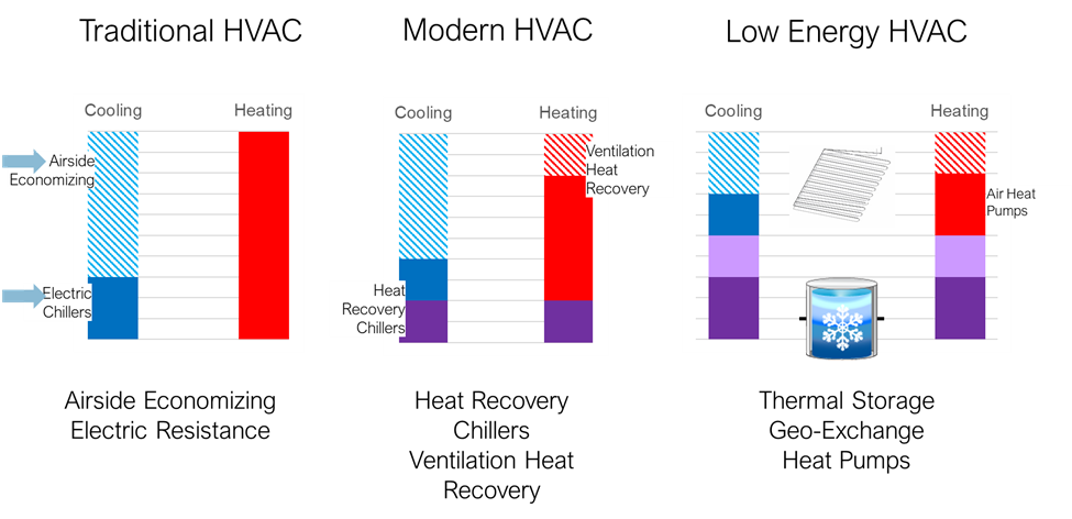 While moving heat through forced air seems like the standard, air is one of the least efficient ways of moving energy and one of the hardest to recover energy from. In a decarbonized building, recovering energy in a simple way is necessary. Small pipes moving water, often with zone fan coils, chilled beams or in-slab radiant heating and cooling, not only provides a great mechanism for heating and cooling, but it also keeps energy primarily in the water, enabling more ways to recover heat and move heat. These systems form the foundation and can be readily combined with heat recovery, thermal storage, and heat pumps. Traditional systems are mostly engineered for efficient cooling, leveraging airside economizing though losing any low-grade heat to the outside air. A decarbonized HVAC system focuses on heating and cooling and the balance of both, finding ways to shift heat with heat recovery heat pumps or thermal storage, and recovery heat with ventilation heat recovery.
