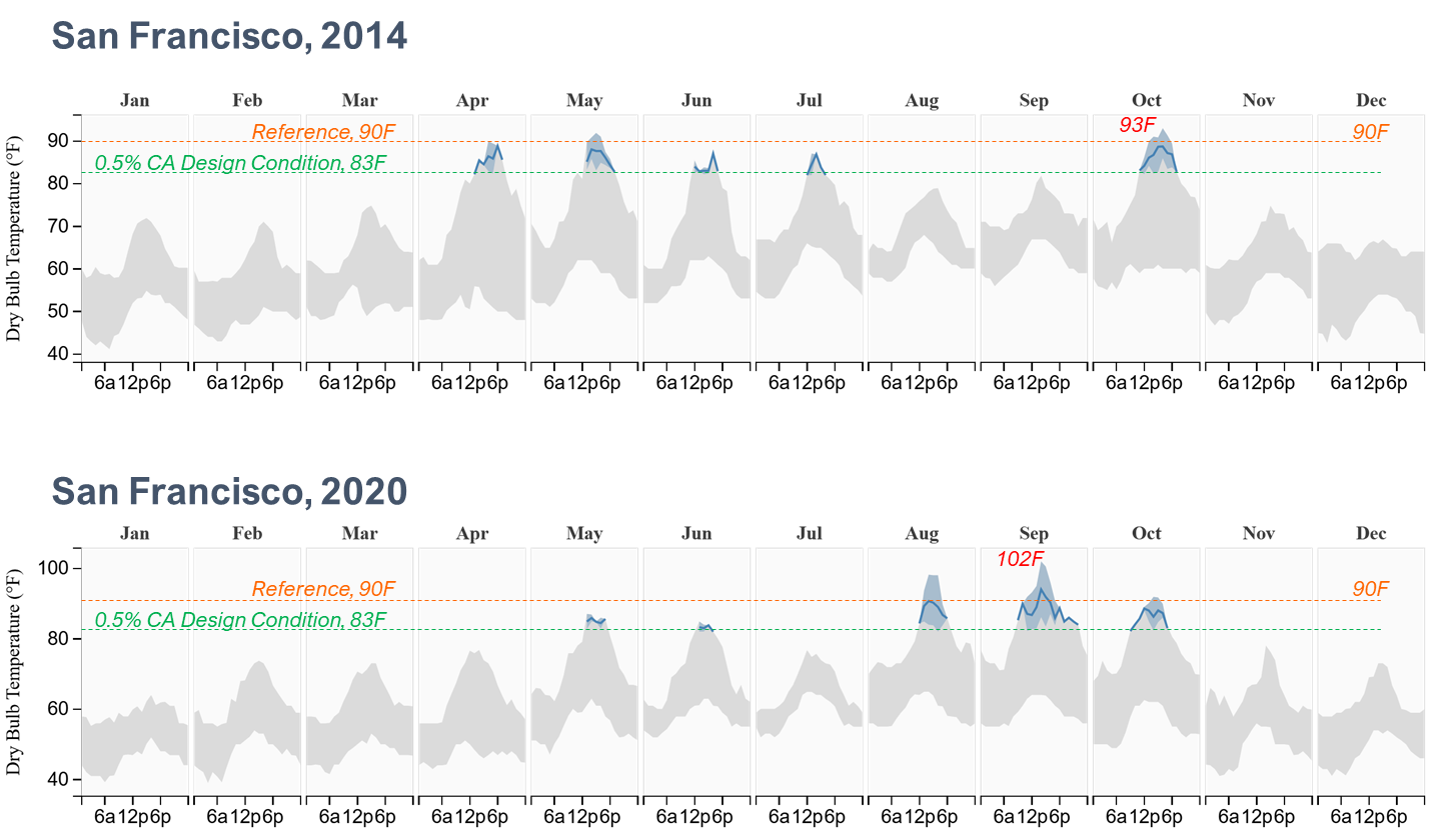 Then climate change began reshuffling the deck. Peak heat events became more frequent, less predictable, harder to absorb with mass and night flush alone. In one of the campus's newer buildings, a library originally fully passively cooled in Hillsborough, teachers came back after a hot summer and said, simply: we need air conditioning. And they weren't wrong. The climate data below shows the changes and peak events the site experienced, with temperatures hitting 93°F in 2014 and then 102°F in 2020 with a design condition of 83°F.