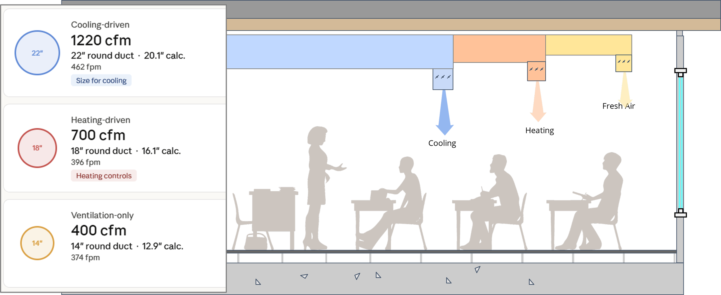 Three duct sizes. Three different design decisions. The gap between cooling-driven and ventilation-only is 8 inches of duct diameter, and everything this idea is about.
