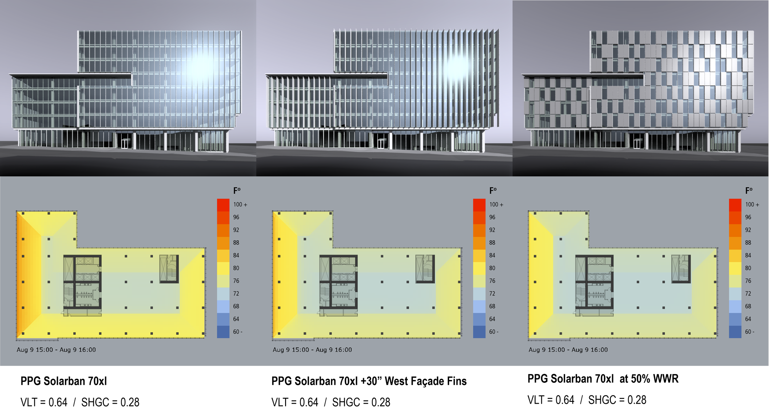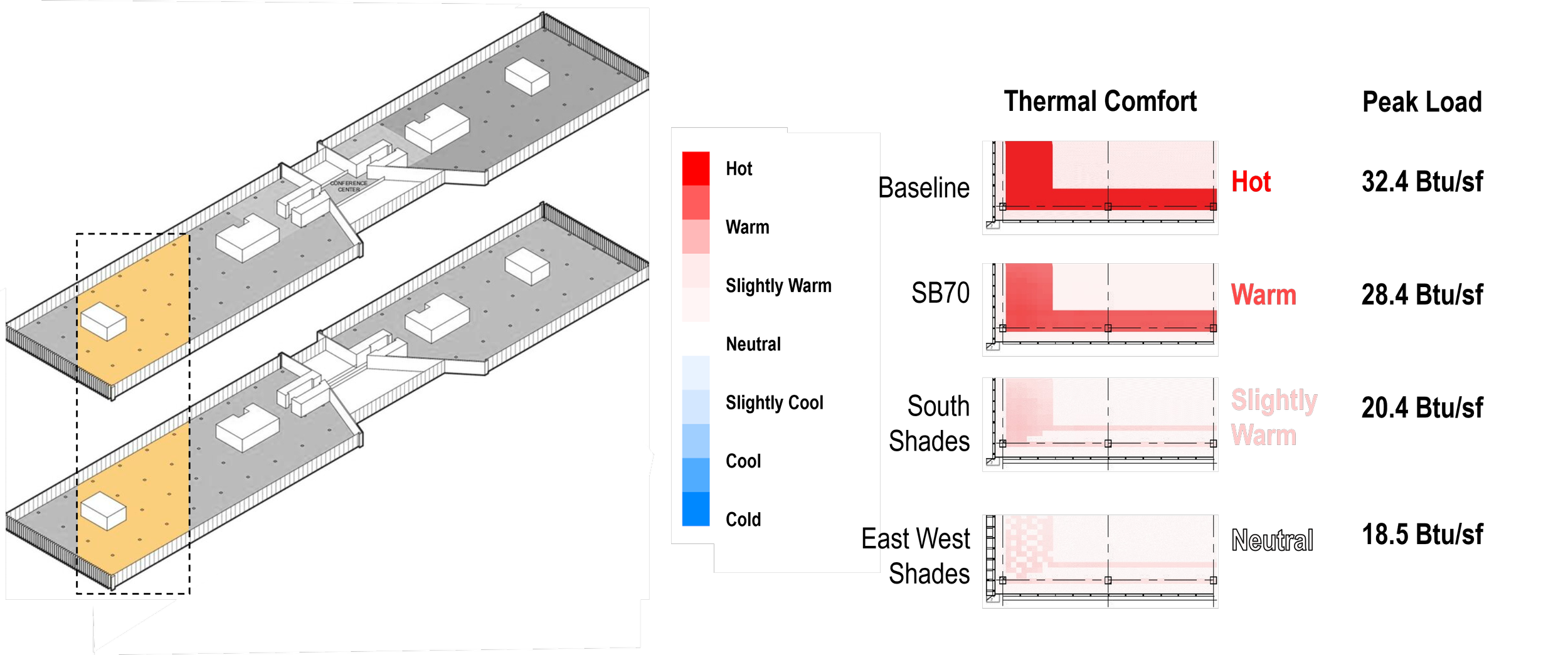 The team evaluated a set number of strategies to bring ideas to the table, changing both the glass type from the design standard and evaluating the impact of shading along façades. While the computation was done based on thermal comfort metrics the final data was shared by labeling the solutions, which resulted in Hot, Warm, and Neutral comfort levels to convey information.