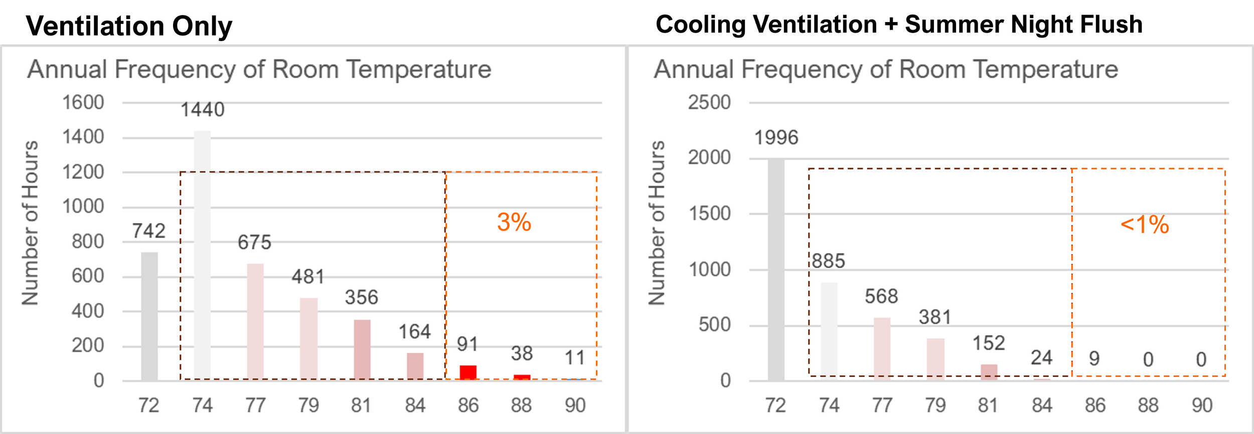 While the technical analysis involved detailed comfort metrics, psychrometric charts, and model outputs, the conversation that ultimately built understanding and consensus was far simpler: focusing on the number of hours indoor temperatures stayed at or below 80°F. This single, relatable metric bridged the gap between technical insight and intuitive understanding — turning a complex comfort discussion into a clear, actionable decision.