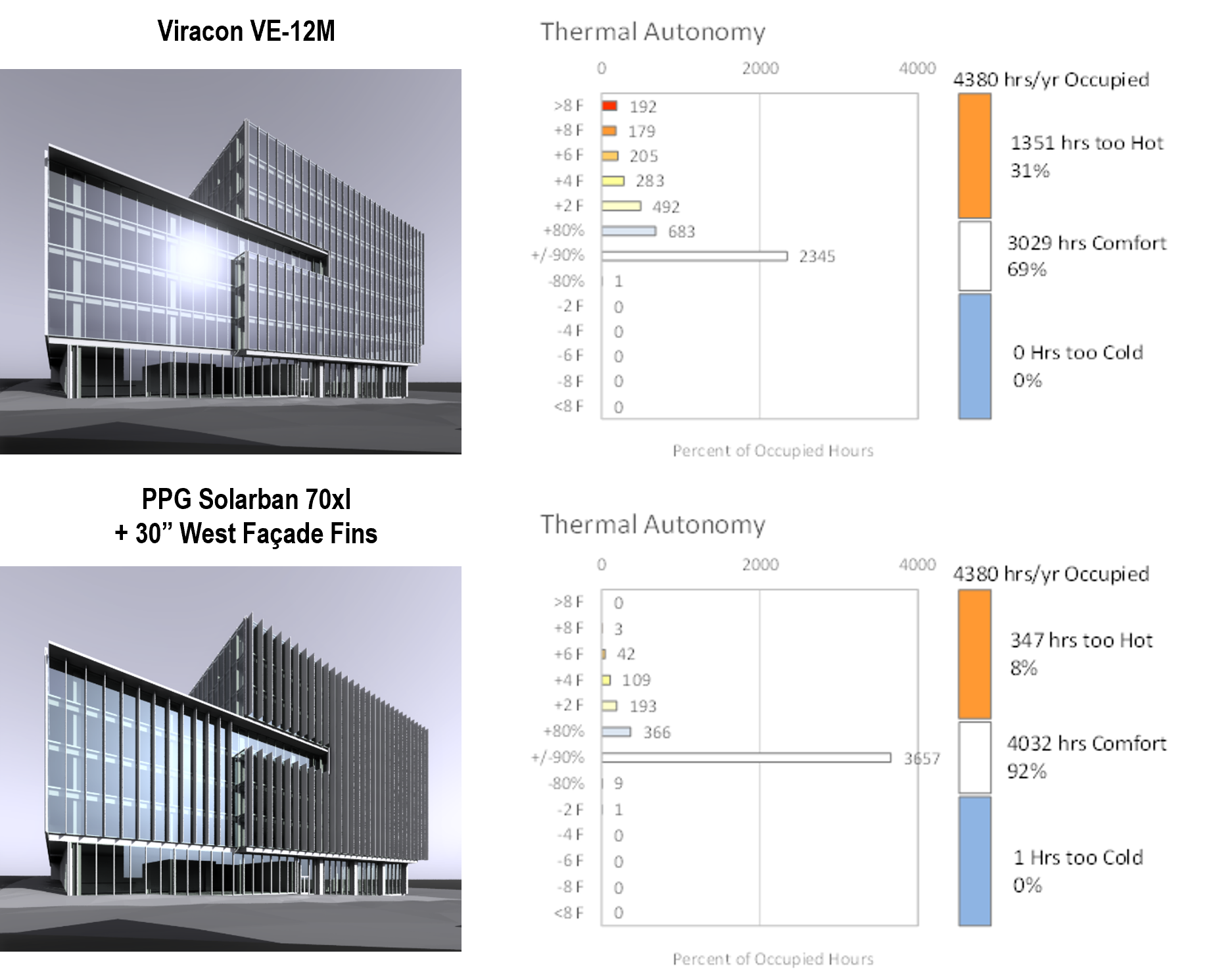 In one study of a west-facing office with nearly full glazing, Thermal Autonomy was used to quantify the impact of improved shading strategies. The analysis revealed that by introducing 30-inch exterior fins and reducing the glazing area, the perimeter zone experienced a dramatic reduction in discomfort, from 1351 hours to hot to 347 hours, less than 10% of the time the building was occupied. Most of the remaining hours fell within a modest +2°F to +4°F above the comfort threshold, demonstrating how effectively small design adjustments can reclaim thermal balance across a year’s worth of conditions.